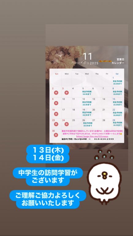 #盛岡 #仙北 #向中野 #盛岡整骨院 #仙北整骨院 #ケガ盛岡 #交通事故盛岡#プロスポーツ選手も通う整骨院 #企業理念 #11月予定表