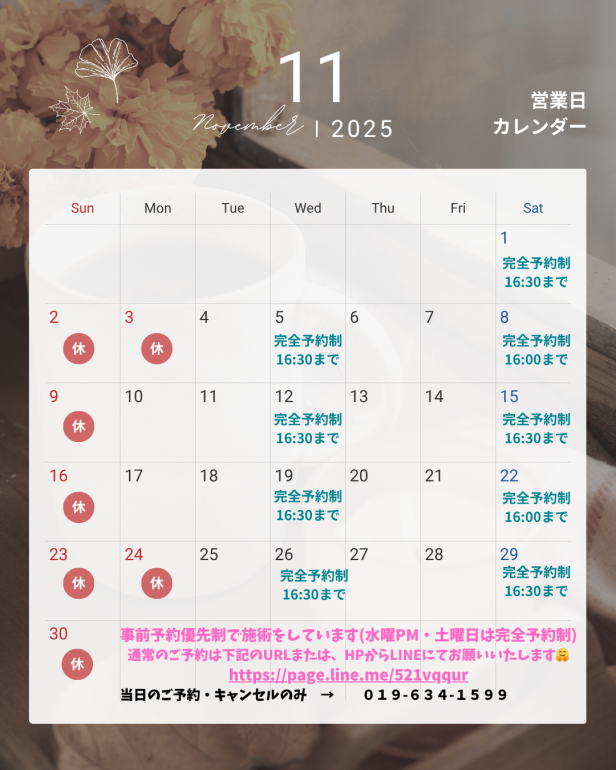 #盛岡 #仙北 #向中野 #盛岡整骨院 #仙北整骨院 #ケガ盛岡 #交通事故盛岡#プロスポーツ選手も通う整骨院 #企業理念 #11月予定表